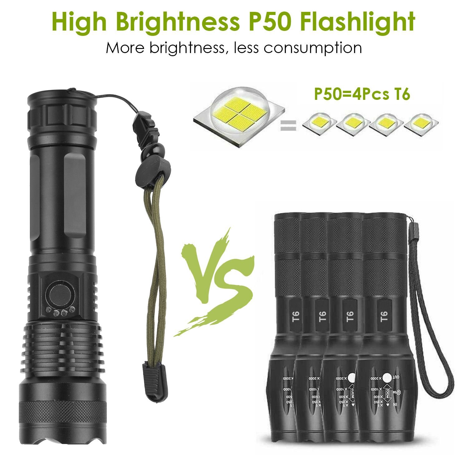 *Zoomable Flashlight & Adjustable Focus*:Our premium P50 LED torch supports 1640ft lighting range;easy-controlled head-pulling zoom adjusts focus range for different usage,stretching to adjust its focus and get spot beam and flood beam you need. Bright zoomable focus is optimal for distant observation and wide range illumination.