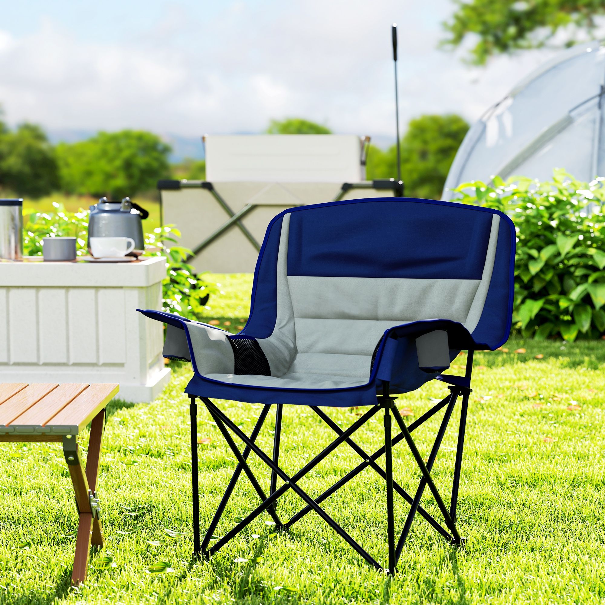 Discover the comfort of the Outsunny backpacking chair, featuring high-density padding in the headrest, backrest, armrests, and seat. Built with a robust metal frame and 600D Oxford fabric, this outdoor chair resists wear and weather. Dual cup holders and side pockets hold all of your camp snacks and drinks. Lightweight and easy to carry, it's suitable for any camping, fishing, or backyard lounging adventure as your go-to portable chair!